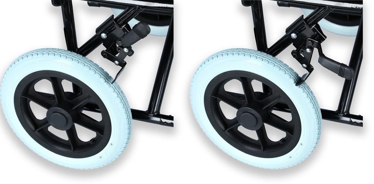 Roțile scaunului cu rotile sunt echipate cu frâne de parcare standard.