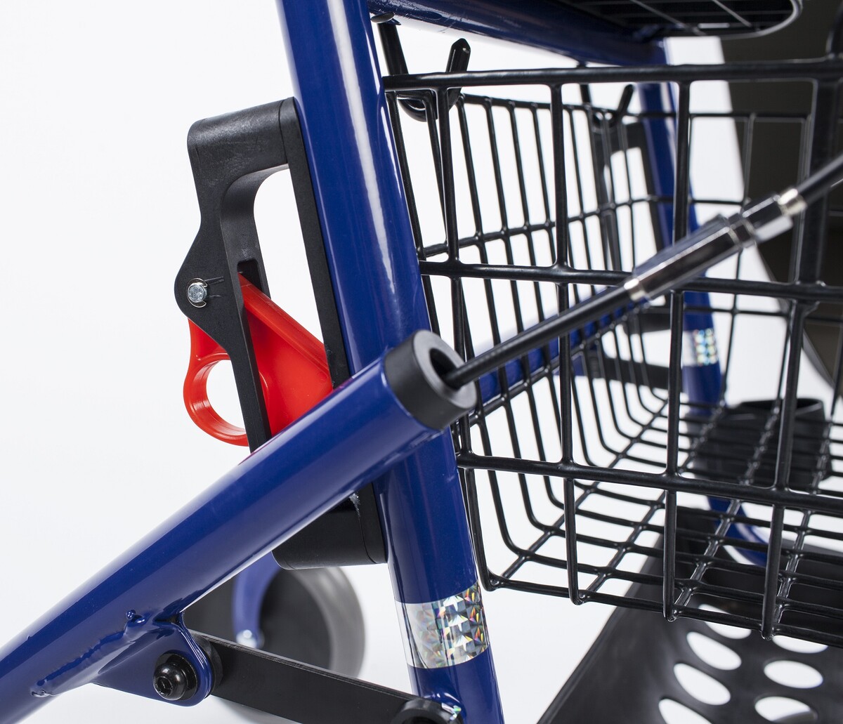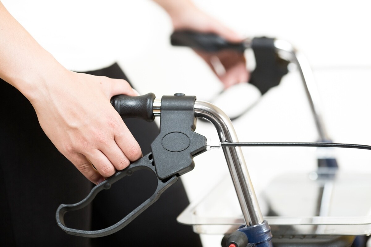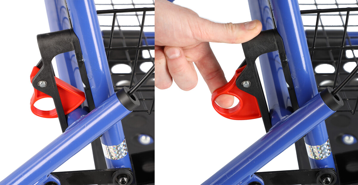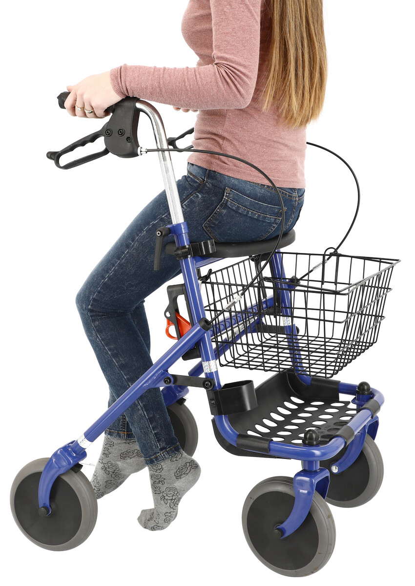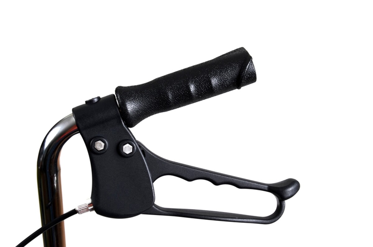 Premergător cu patru roți are 2 tipuri de frâne: trăgând de mâner, acționați ușor frânele iar prin apăsarea frânei în jos activați frâna de parcare care asigură că rolatorul cu patru roți este frânat complet făcându-l pregătit pentru a te așeza. Pentru confortul utilizatorului, frânele pot fi reglate în diferite poziții.