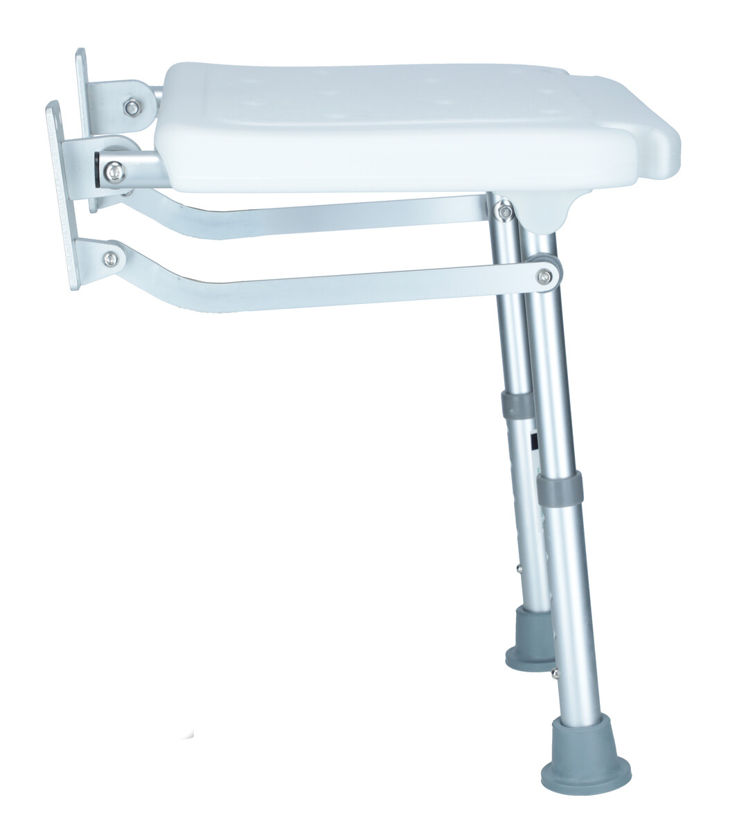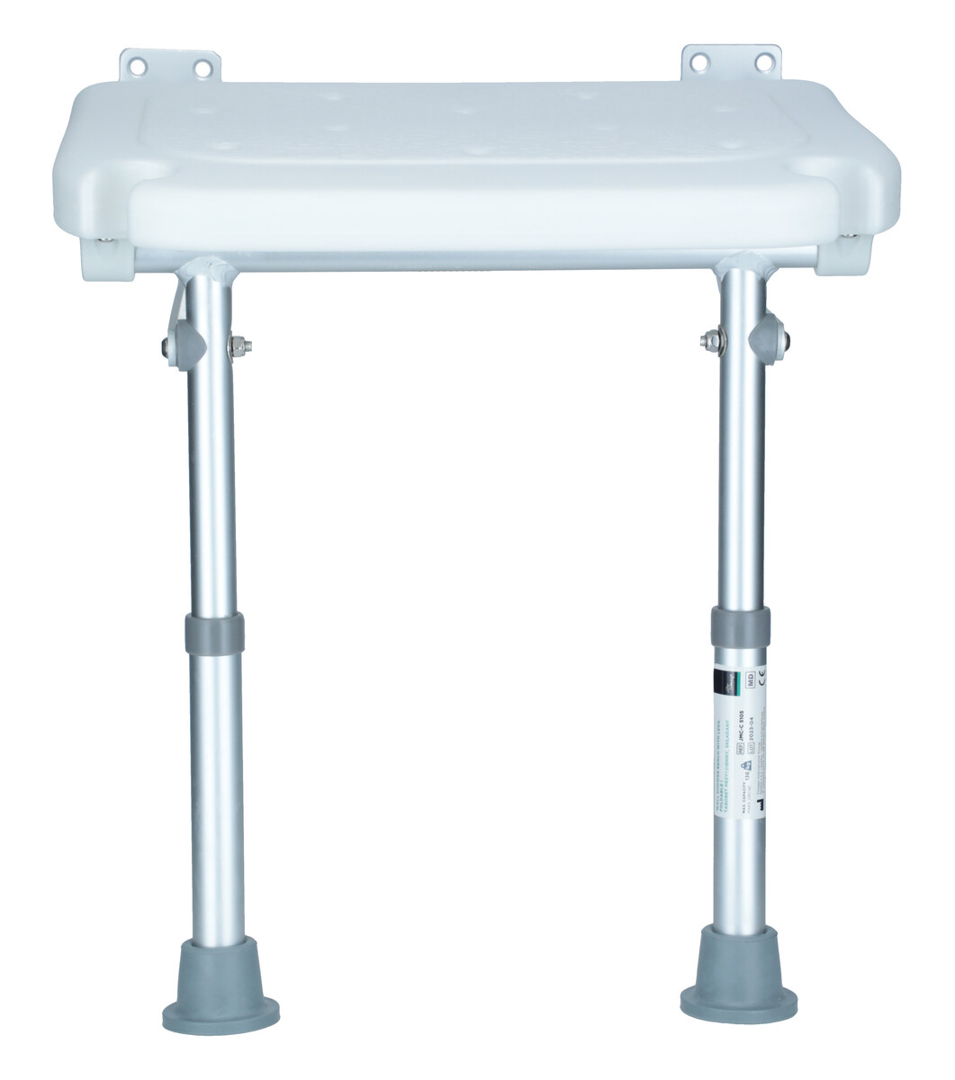Scaunul de duș rabatabil cu picioare, montat pe perete, reglabil pe înălțime, este destinat pacienților care nu pot sta în picioare pe toată durata dușului. Scaunul este fixat de perete cu șuruburi.