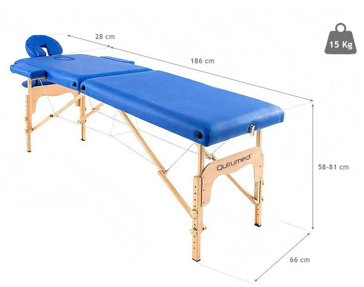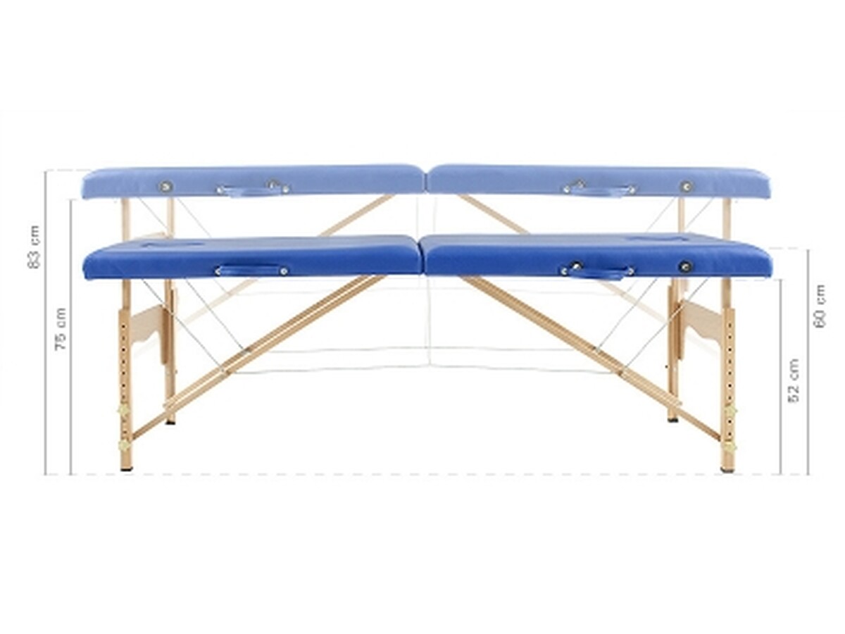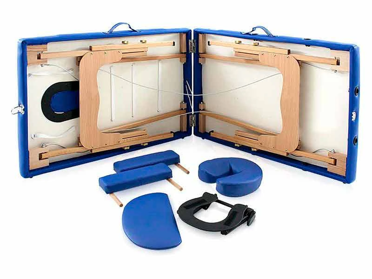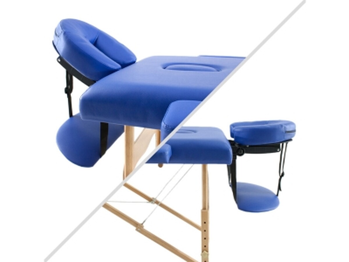 Patul pentru masaj din lemn compus din două părți având o suprafață de lucru largă, lungă și confortabilă. Poate fi folosit ca șezlong static în salon sau ca șezlong portabil simplu într-o geantă.