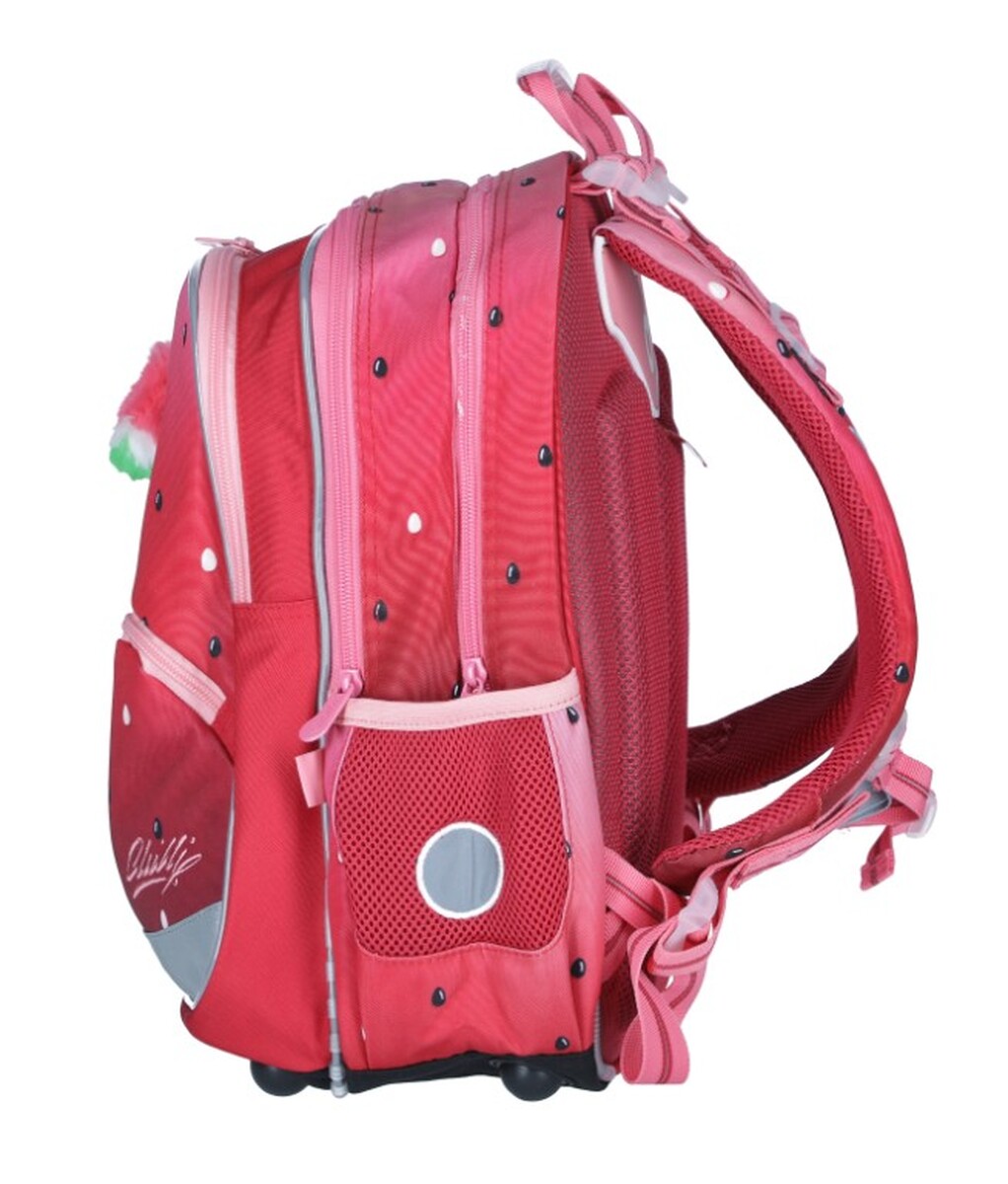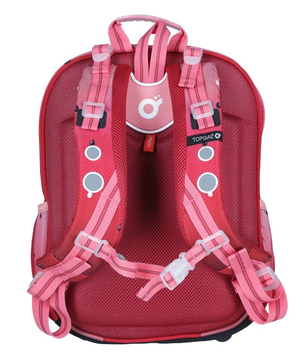 Spatele întărit din spumă moale presată , curelele de umăr reglabile întărite și o centură la piept asigură că ghiozdanul este ținut corect pe spate. Bretelele au formă anatomică și se adaptează siluetei prin prindere în părțile superioare și inferioare , datorită cărora se vor așeza corect chiar și pe spatele mic al copilului. Capetele curelelor sunt echipate cu magneți, astfel încât nu vor sta în cale la purtare. Cureaua de piept reglabilă pe înălțime va asigura că curelele nu alunecă nici măcar de pe umerii îngusti.