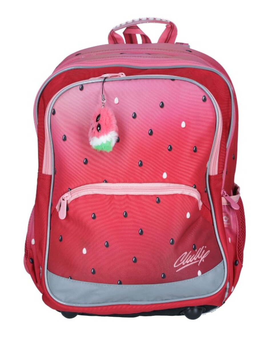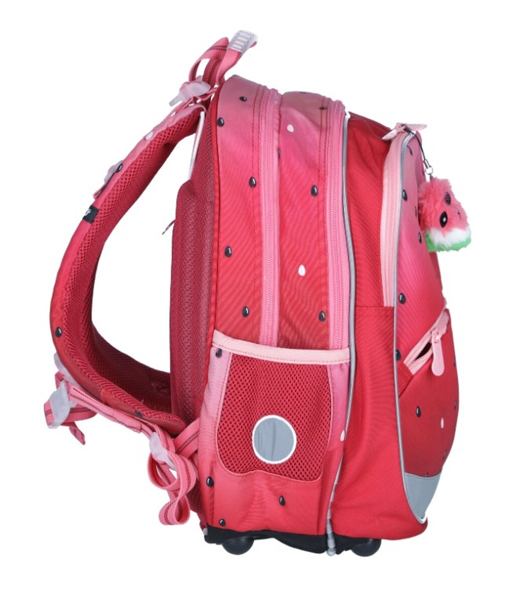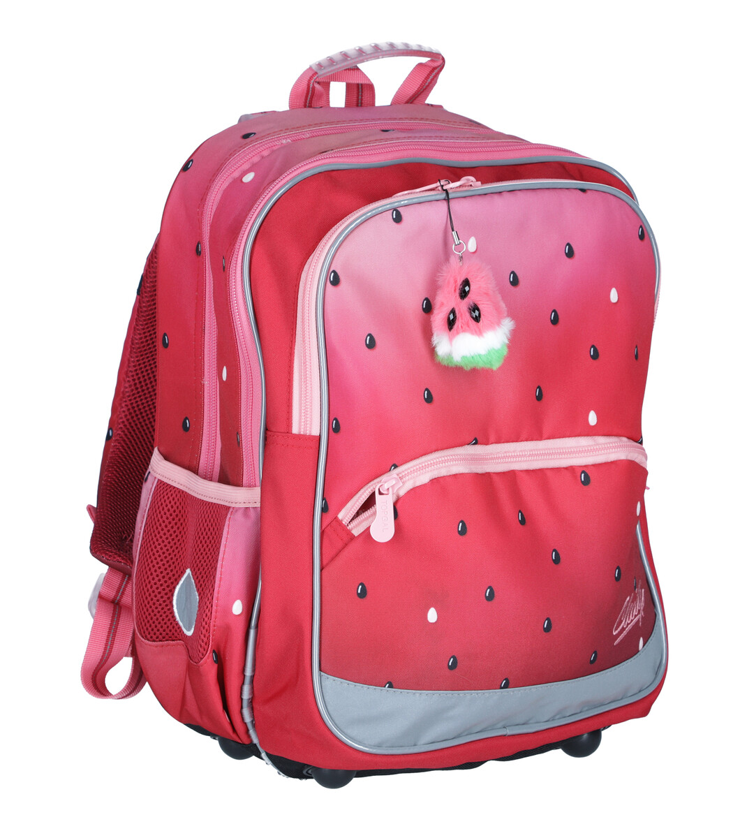 Datorită dimensiunilor sale compacte și greutății reduse, ghiozdanul BAZI cu motiv pepene galben este ideal pentru școlarile mici din clasa întâi a școlilor primare. Designul colorat, completat cu pandantiv în formă de pepene galben, va mulțumi cu siguranță multe doamne, iar greutatea de mai puțin de 1 kilogram va mulțumi fiecare părinte.