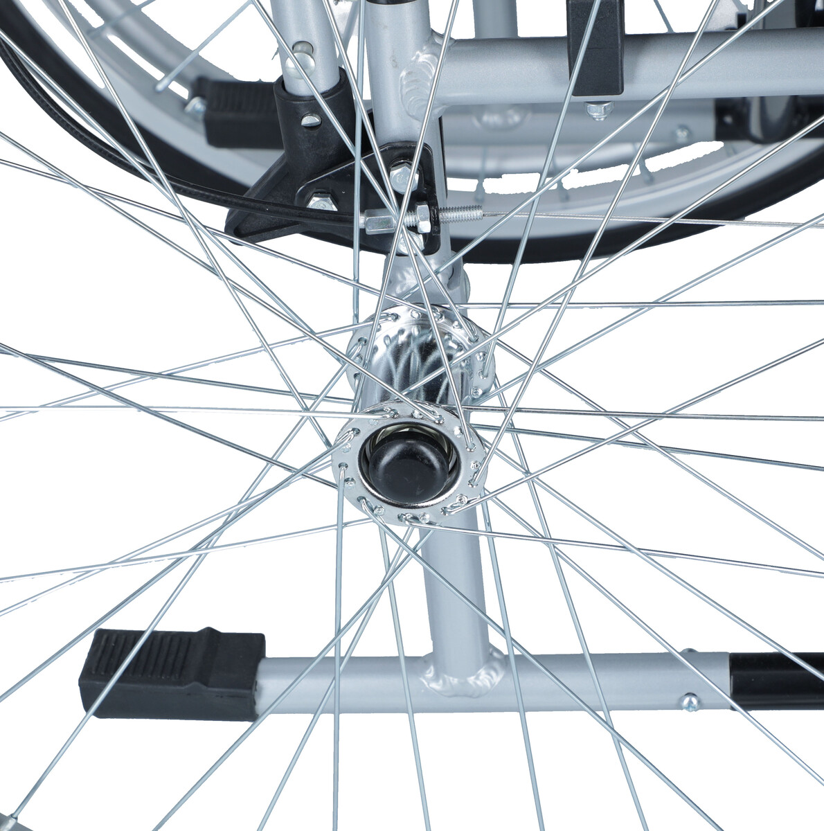 Roțile din spate sunt cu eliberare rapidă și pot fi îndepărtate apăsând butonul negru din centrul roții.