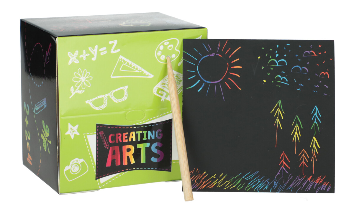Culorile vibrante sunt ascunse sub stratul superior negru, ceea ce vă permite să creați imagini colorate prin punctare și desen pe suprafață.