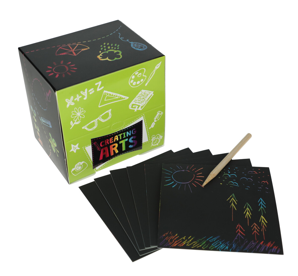Setul creativ Creating Arts prezintă un blocnotes care vă va surprinde cu un curcubeu de culori sub o suprafață neagră mată.