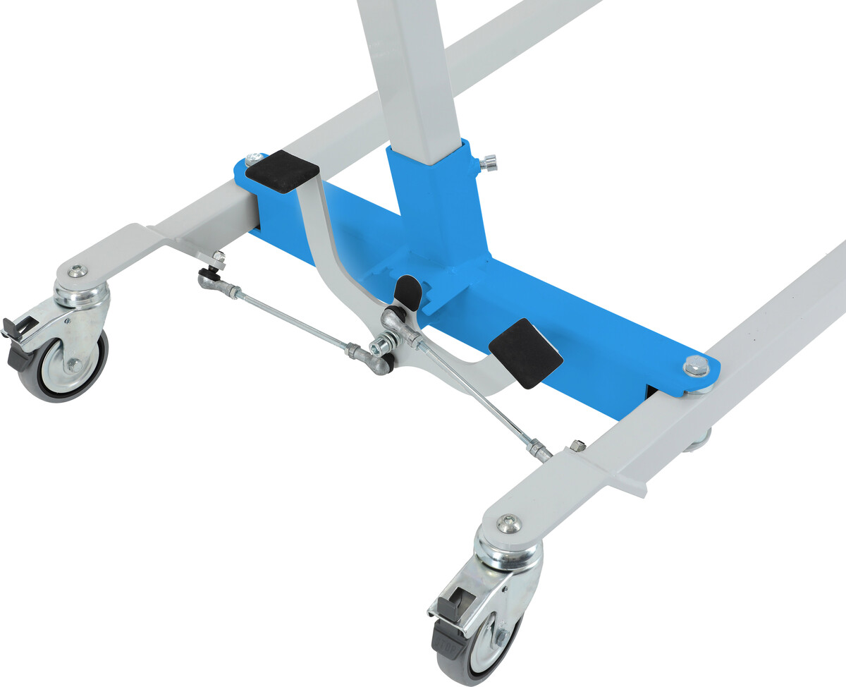 Cricul este realizat din oțel vopsit rezistent, mânerul este din poliuretan. Baza are formă pătrată, patru roți pivotante cu diametrul de 10 cm, dintre care două au frână. Baza cricului este reglabilă și asigură stabilitate și mișcare ușoară chiar și în zonele cu spațiu limitat.
