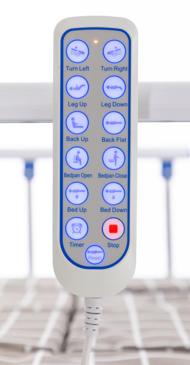 Comandă electrică cu șase funcții de reglare: înălțimea patului, cronometru de poziționare, spătar, suport pentru picioare, funcție de rotație totală a corpului spre stânga și dreapta, și funcția de extindere a găleții de toaletă.