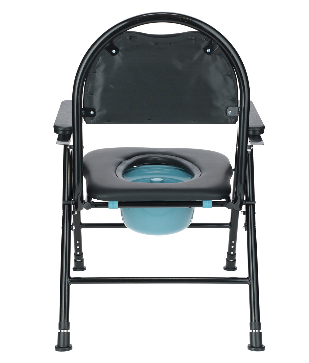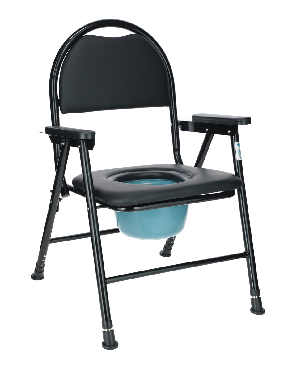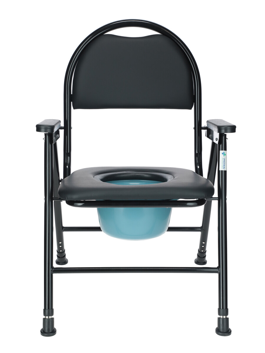 Scaunul de toaletă pliabil UNIZDRAV cu un decupaj igienic și o găleată din plastic servește ca înlocuitor de toaletă pentru pacienții cu mobilitate redusă. Găleata este echipată cu un capac care împiedică scăparea mirosurilor neplăcute. Recipientul poate fi scos din partea de jos a scaunului și partea din față a scaunului.