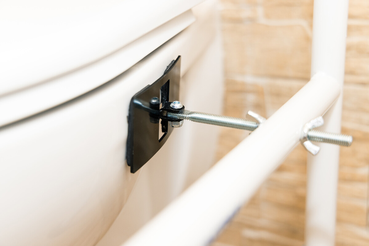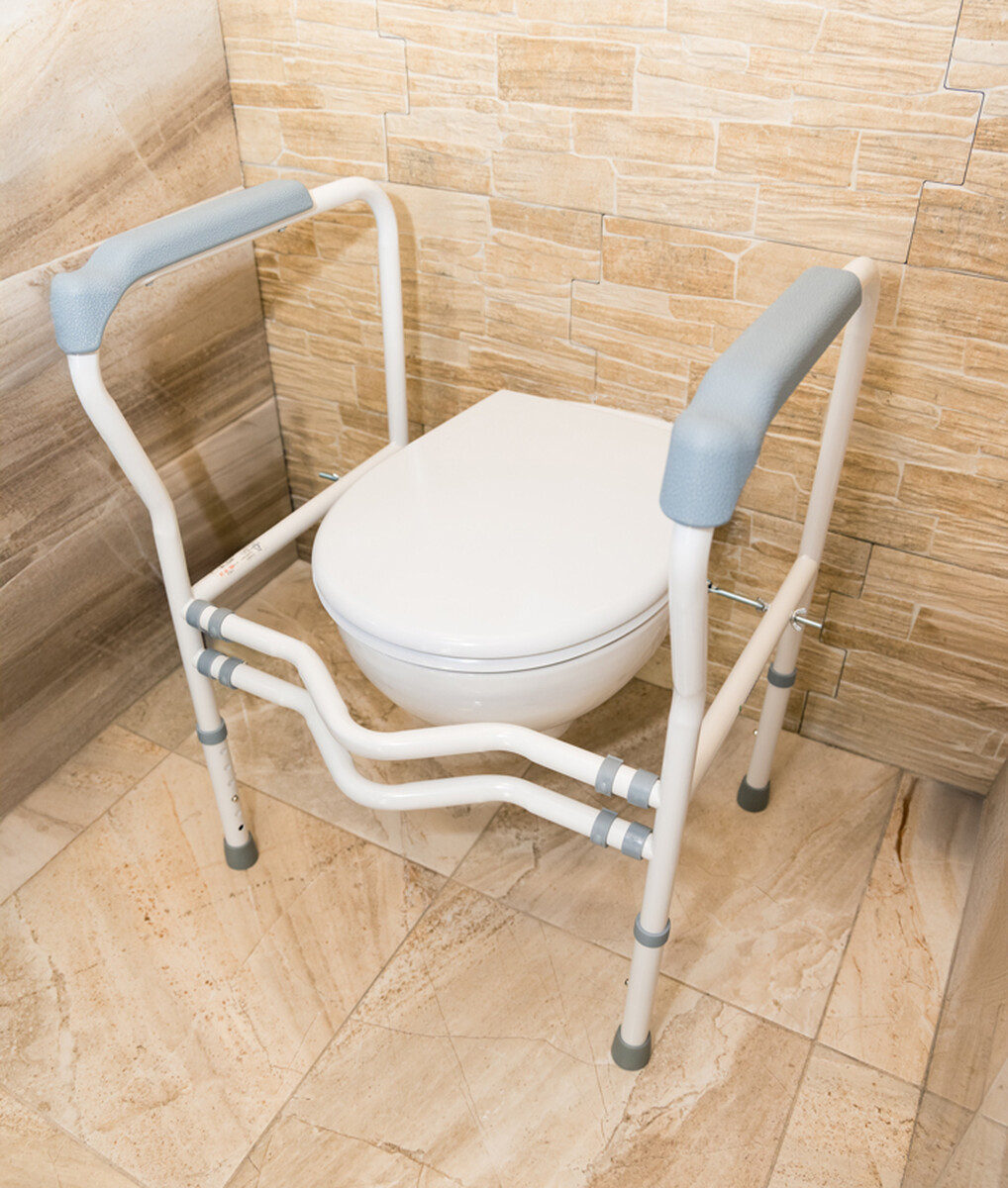 Un suport pentru toaletă cu structură reglabilă care facilitează utilizarea toaletei pentru persoanele cu mobilitate redusă.