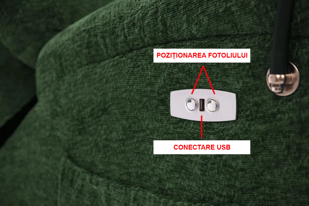 Scaunul este echipat cu un sistem de poziționare electrică controlat de butoane laterale. Mai întâi suportul pentru picioare începe să se plieze în sus , apoi spătarul începe și el să se plieze în jos. Depinde de tine ce poziție alegi. De acum înainte, odihna, cititul, vizionarea serialelor preferate sau jocurile sau lucrul pe dispozitivul mobil vor fi întotdeauna... o experiență relaxantă.