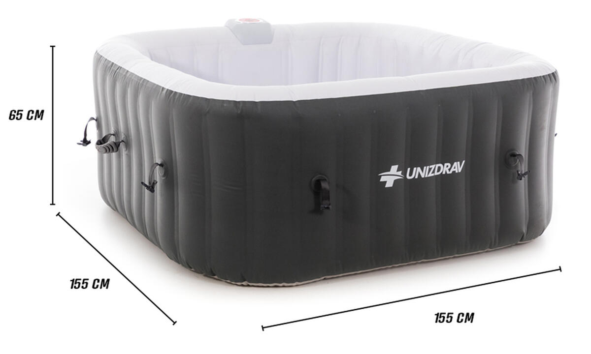 Căutați o jacuzzi cu hidromasaj care să vă ofere relaxare perfectă fără a ocupa mult spațiu? Jacuzzi cu hidromasaj gonflabilă premium UNIZDRAV, ideală pentru 4-6 persoane, este potrivită și pentru grădini mai mici, terase sau interioare, datorită dimensiunilor sale compacte de 155 x 155 x 65 cm. Și, ceea ce este cel mai bine - vă puteți bucura de el tot timpul anului. Vara, îl puteți amplasa afară, iar iarna îl puteți muta într-o zonă temperată și vă puteți răsfăța cu o baie fierbinte chiar și în zilele reci.