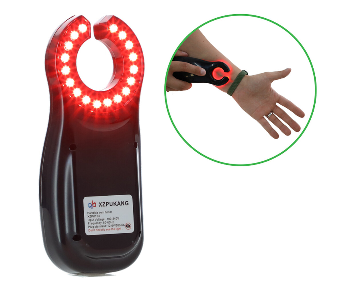 Detectorul de vene este ușor, compact și poate fi operat cu o singură mână. Se activează prin apăsarea unui buton lateral, care aprinde LED-urile. Deschiderea în formă de „C” permite apoi introducerea acului fără a fi nevoie să puneți dispozitivul jos.