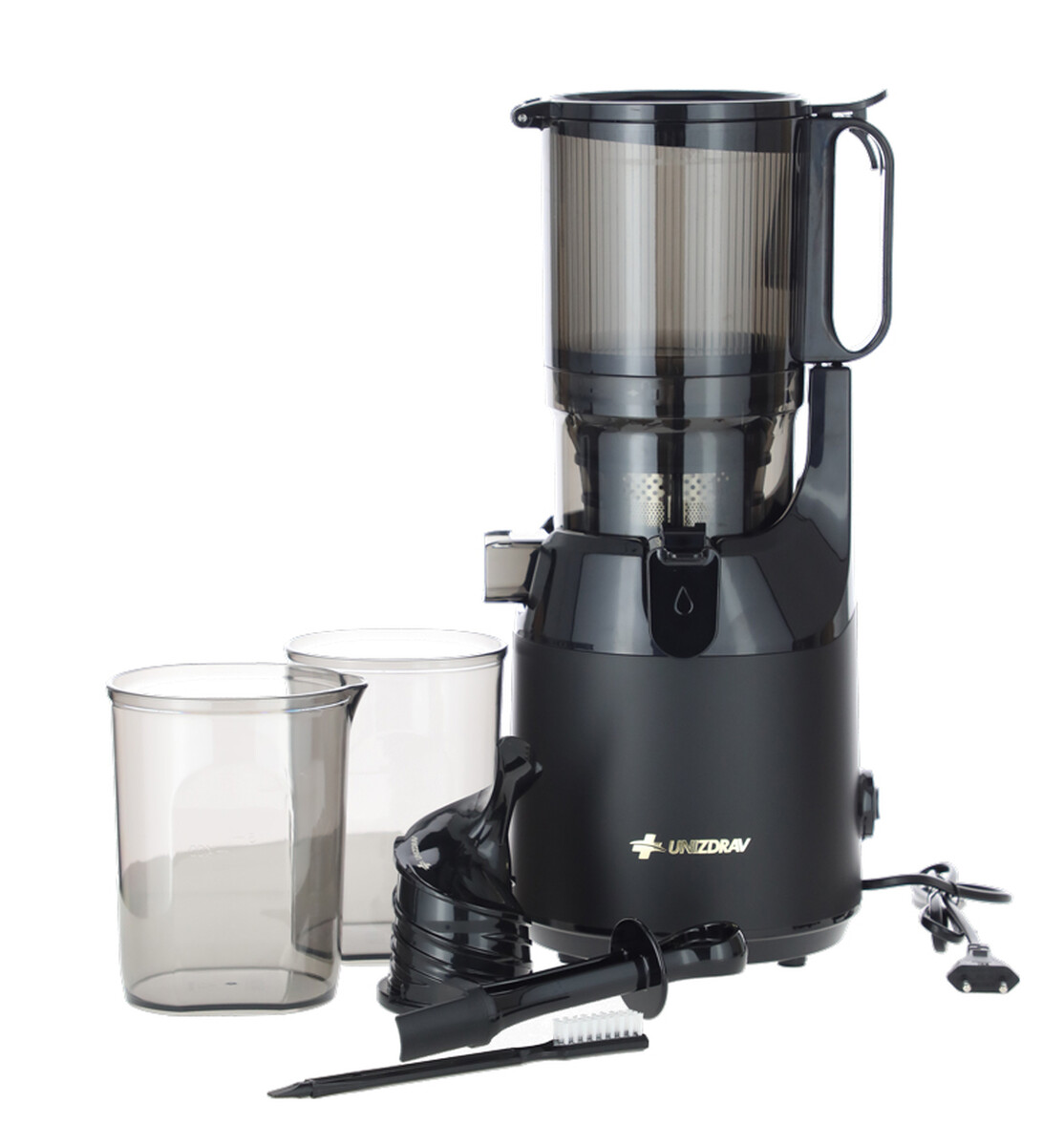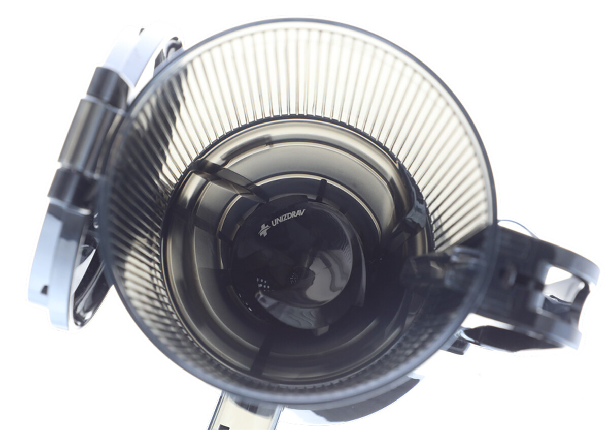 Storcătorul cu melc UNIZDRAV are o gaură de umplere foarte mare și un sistem fiabil de stoarcere cu unghi mic, care păstrează nutrienții maximi ai materiilor prime folosite.