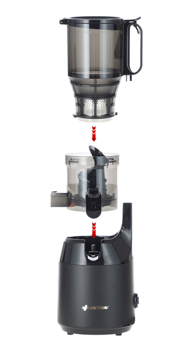 Storcatorul cu surub UNIZDRAV a fost proiectat cu o deschidere de umplere XXL cu un diametru de pana la 13 cm. Bucățile mai mari de fructe și legume pot fi plasate într-o deschidere suficient de mare în același timp, ceea ce economisește timp pentru preparare și presare. Recipientul pentru suc are o capacitate de aproximativ 1000 ml de lichid, recipientul pentru deșeuri are o capacitate de 900 ml.