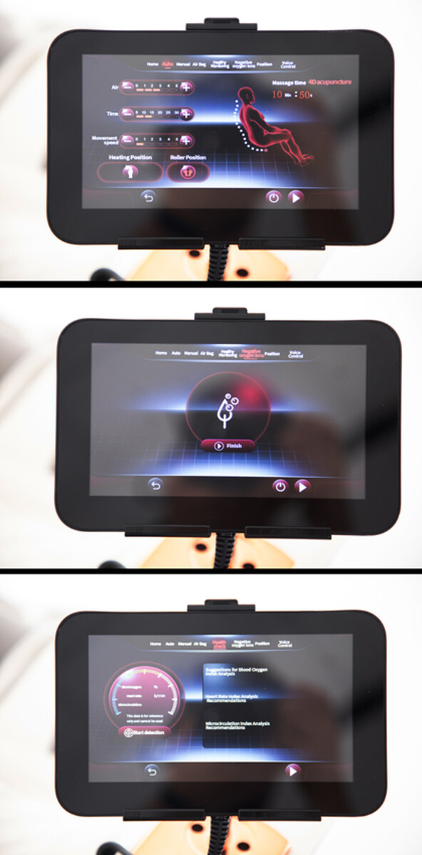 Toate funcțiile disponibile sunt la îndemână în controlul integrat cu o interfață ușor de utilizat. Un ecran LCD tactil mare și un controler rotativ permit personalizarea completă a masajului. Datorită controlului vocal avansat puteți introduce cu ușurință comenzi (în engleză) și puteți controla scaunul și mai confortabil.