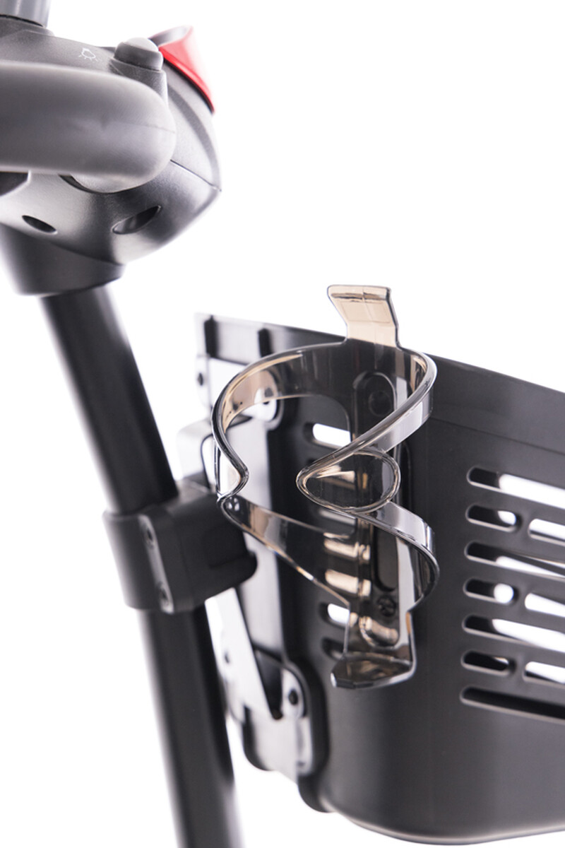 Suportul pentru sticle se atașează ușor direct la coșul scuterului ELITE. Instalarea este desigur, posibilă și pe alte modele care permit o metodă de montare similară.