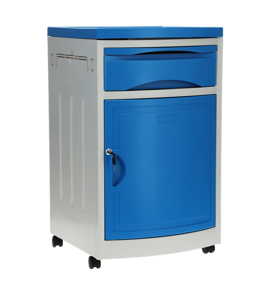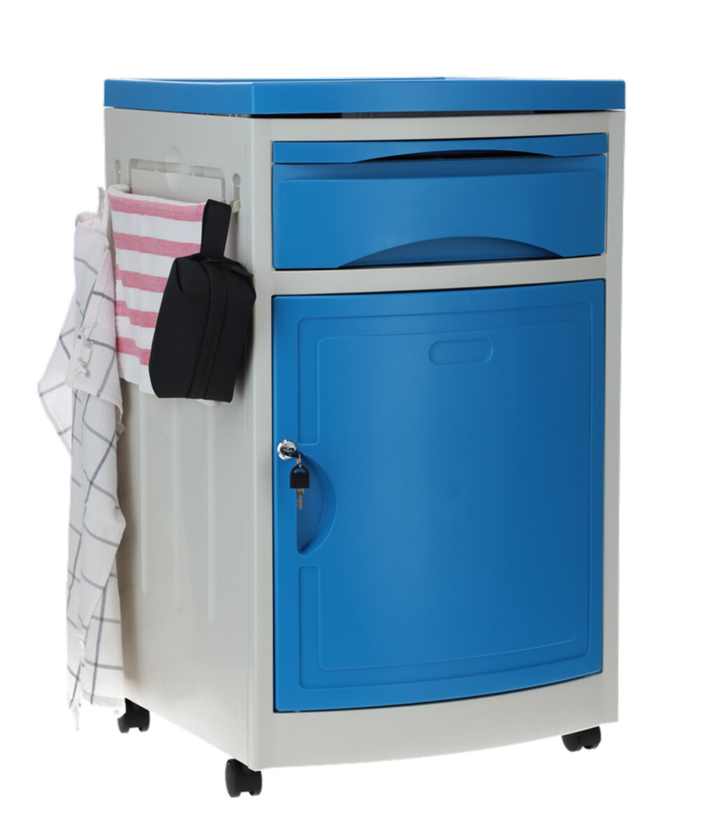 Noptieră de spital pentru paturi reglabile oferă mult spațiu de depozitare. Pe lângă dulapul de bază și sertarul, este echipat cu o masă de extensibilă și umerașe laterale practice.