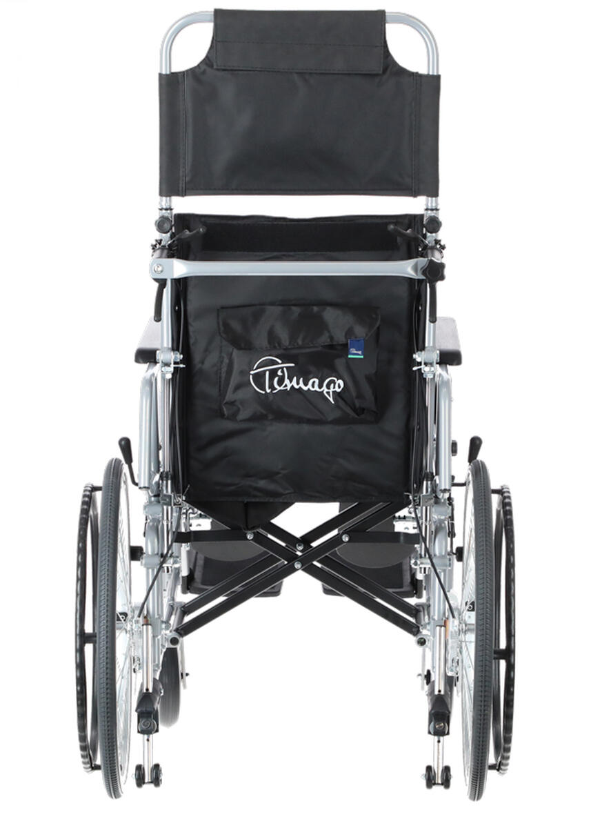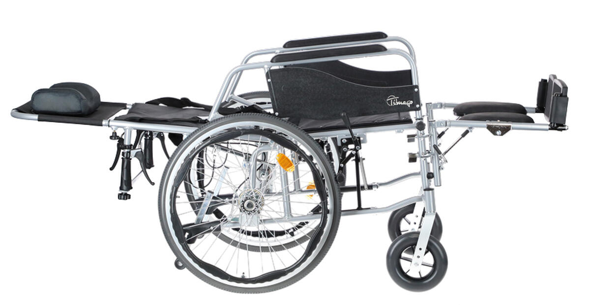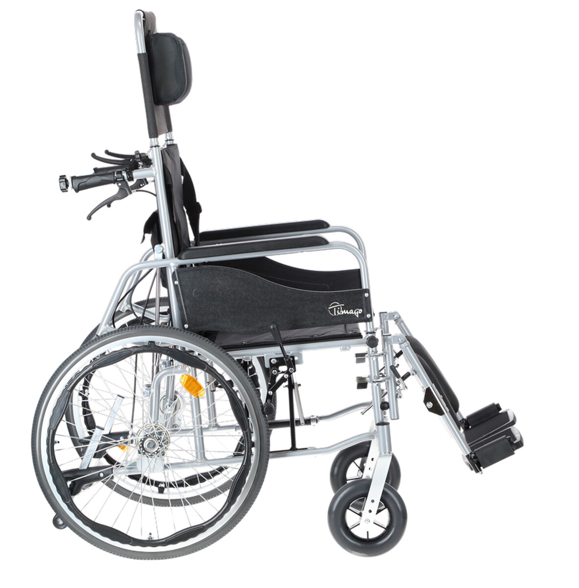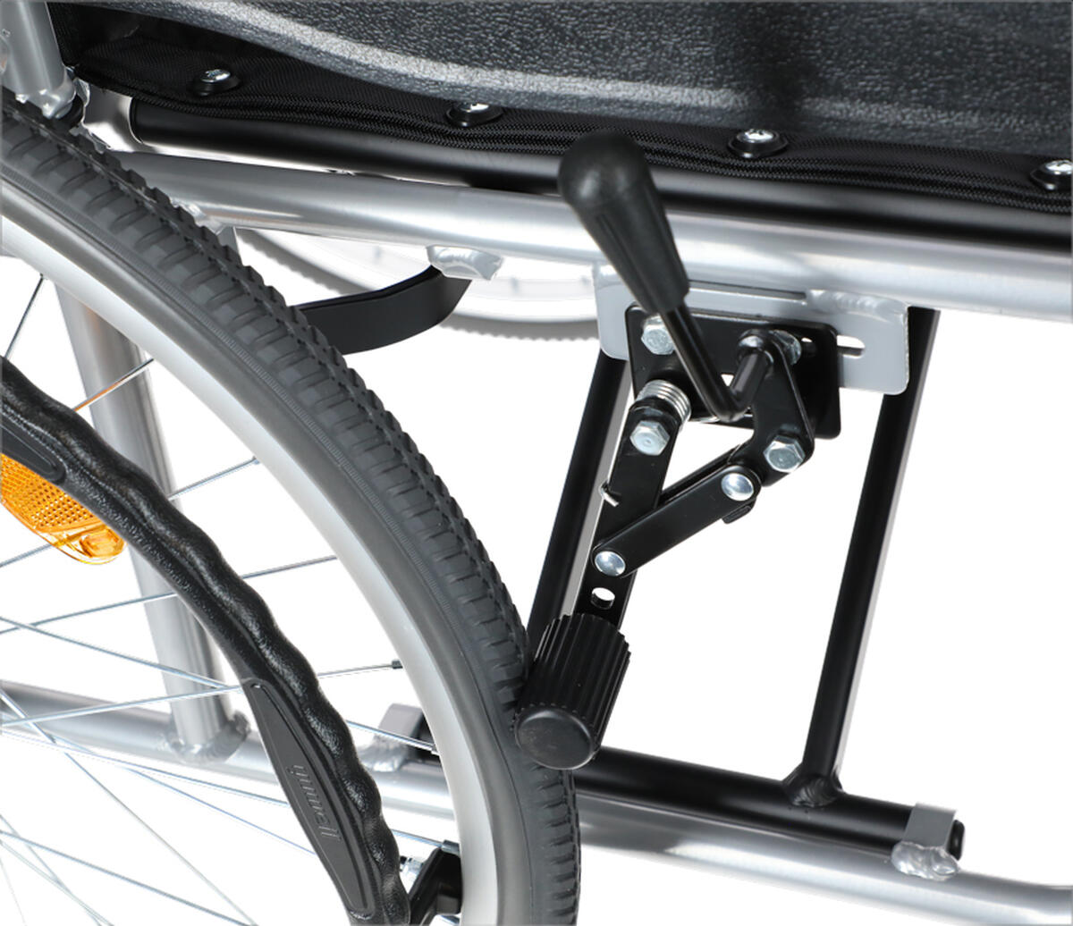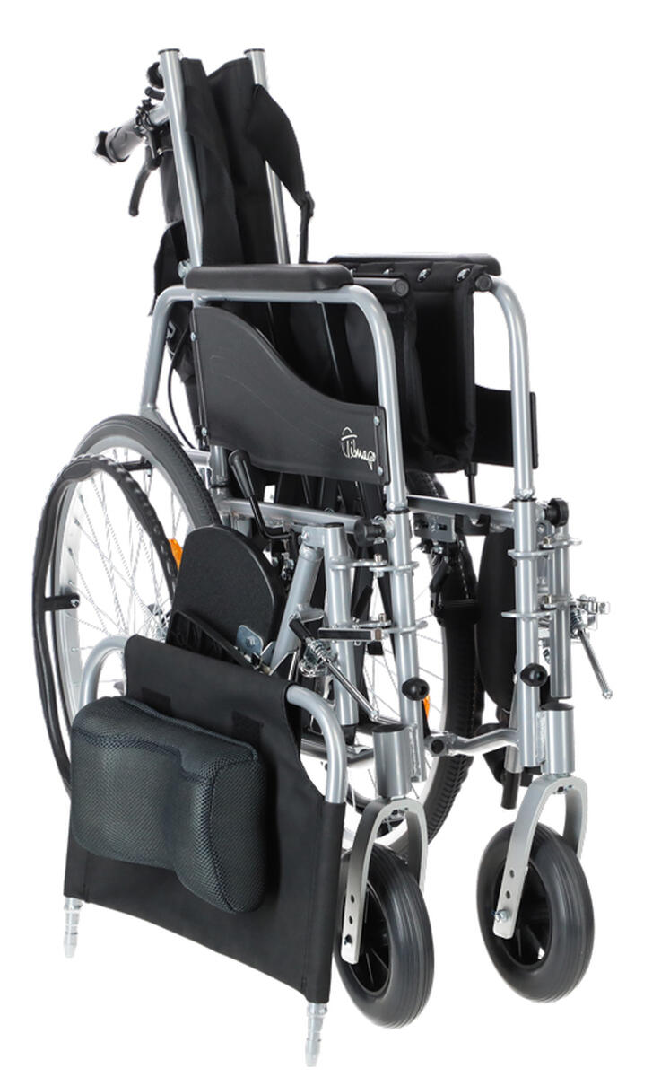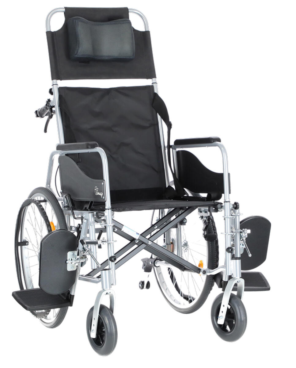 Scaunul rulant este echipat cu o funcție de poziționare a spătarului care vă permite să reglați unghiul spătarului în intervalul 0 – 90° și să îl setați într-o poziție complet orizontală. Suporturile pentru picioare pot fi reglate simultan în unghi și, de asemenea, lateral.