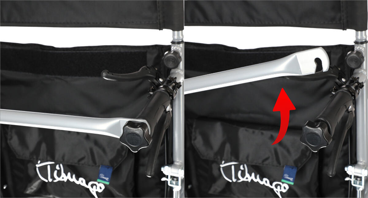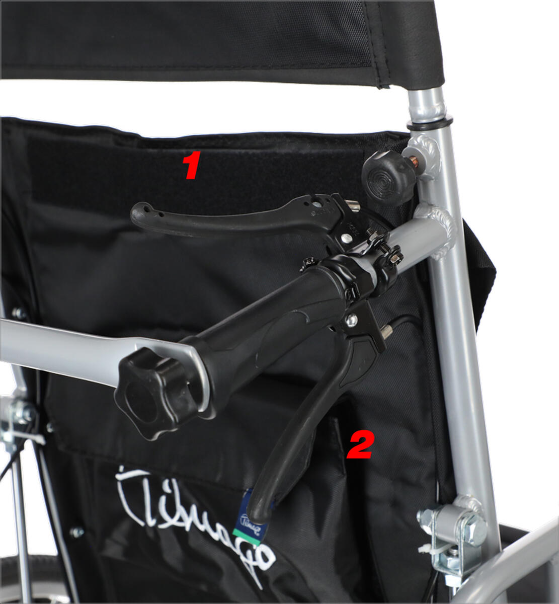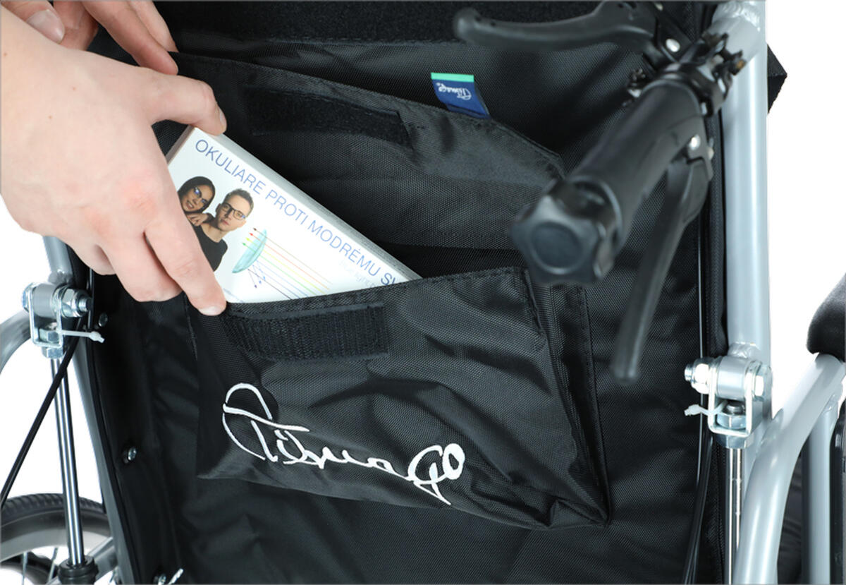 Pentru persoana însoțitoare sunt disponibile mânere și o bară stabilizatoare opțională. În zona mânerelor, există un control separat de înclinare a spătarului în partea de sus și un control de frână în partea de jos. Un plus practic este un buzunar pentru depozitarea accesoriilor mai mici.