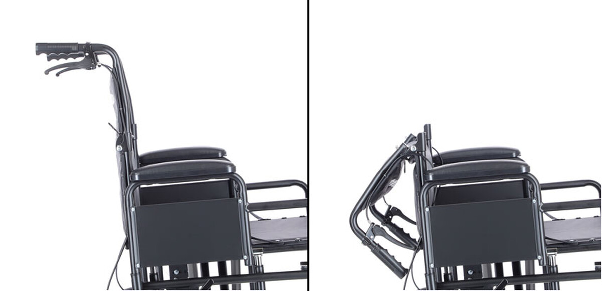Cadrul pliabil din oțel cu o structură în cruce și un suport pentru spate rabatabil permite desfacerea/dezasamblarea rapidă a scaunului cu rotile, ceea ce simplifică depozitarea sau eventual transportul în mașină.
