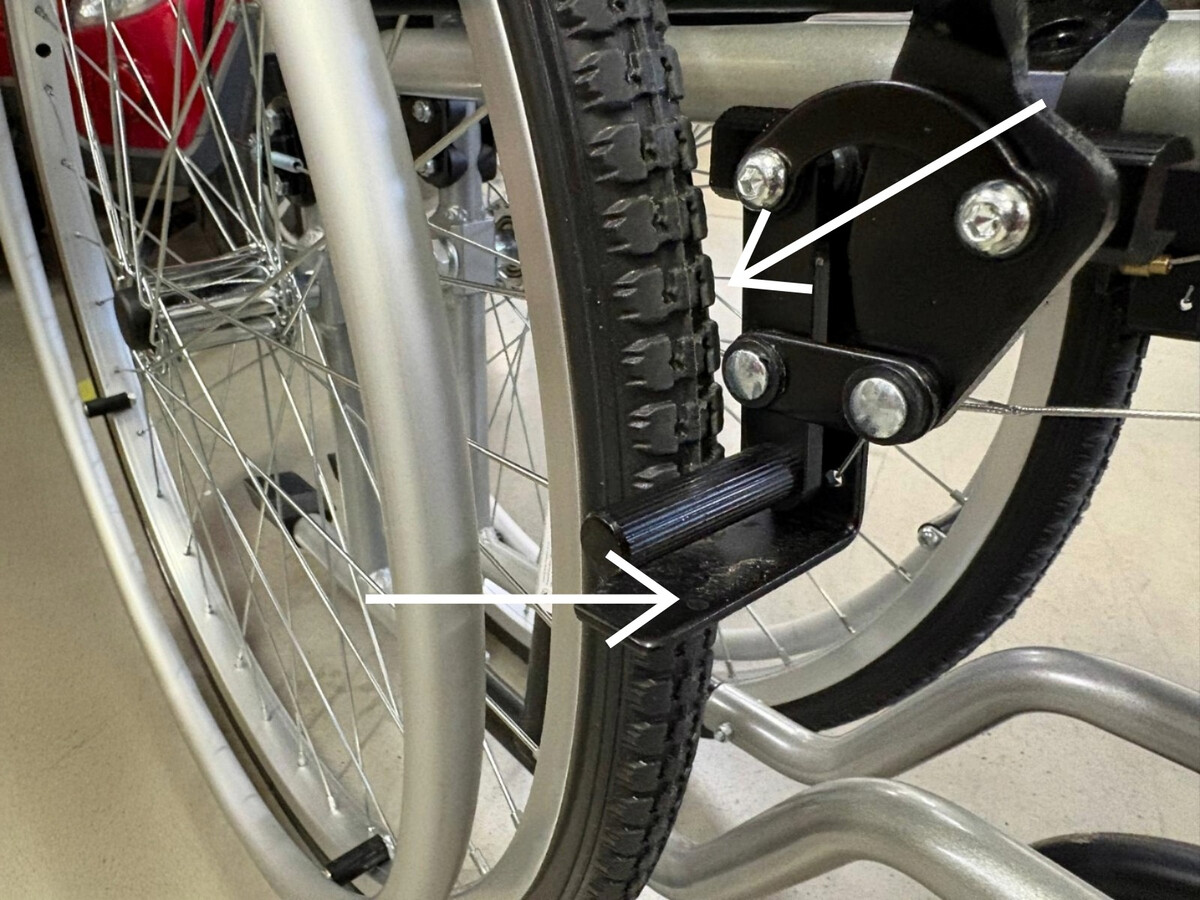 Roțile din spate sunt cu eliberare rapidă și pot fi îndepărtate apăsând butonul negru din centrul roții.