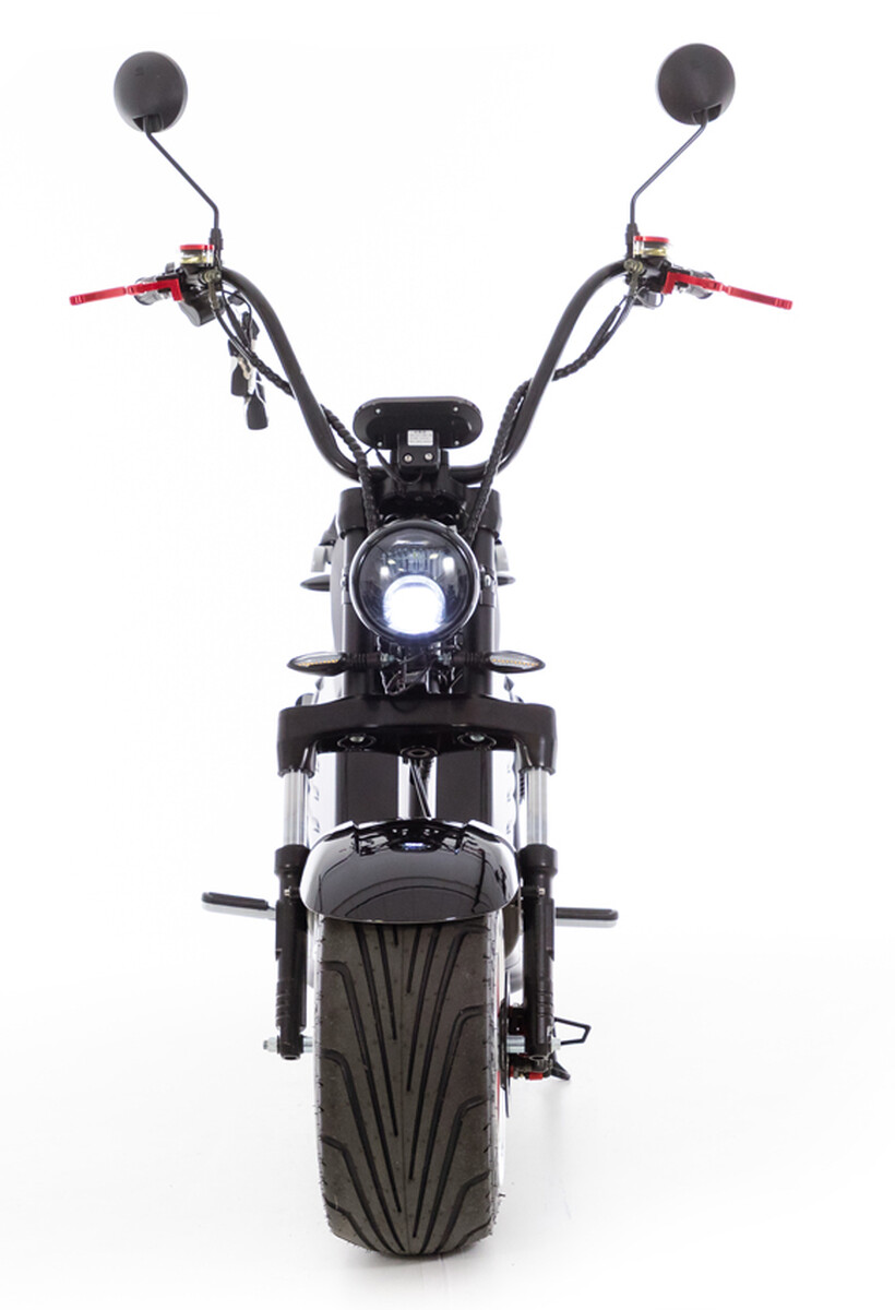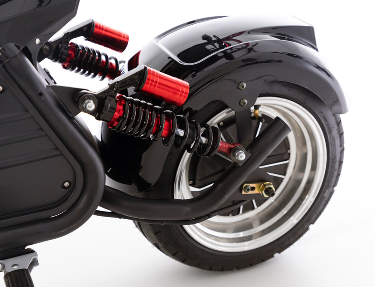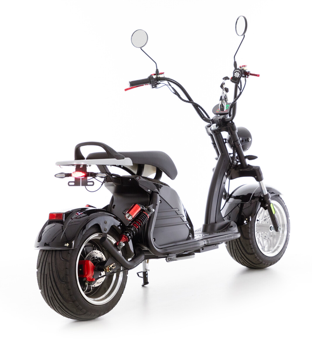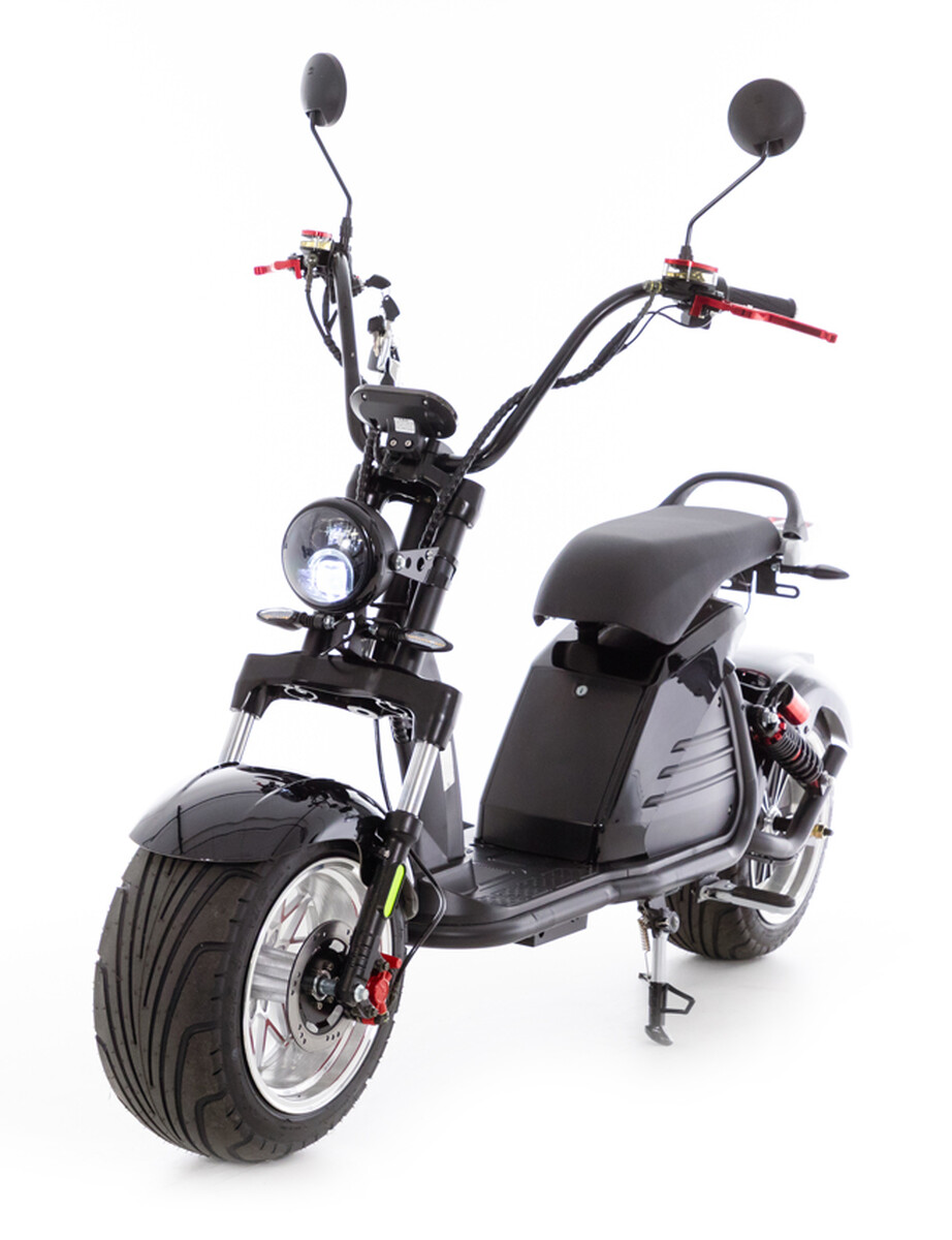 Scuter electric elegant, cu design Chopper, cu un motor puternic de 3000 W, un cadru robust și un confort excelent la condus - ideală atât pentru plimbări în oraș, cât și pentru agrement.