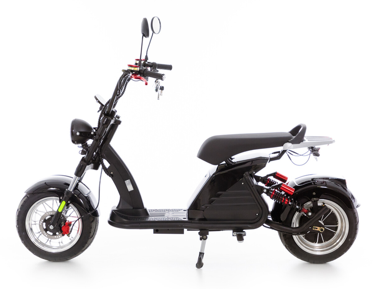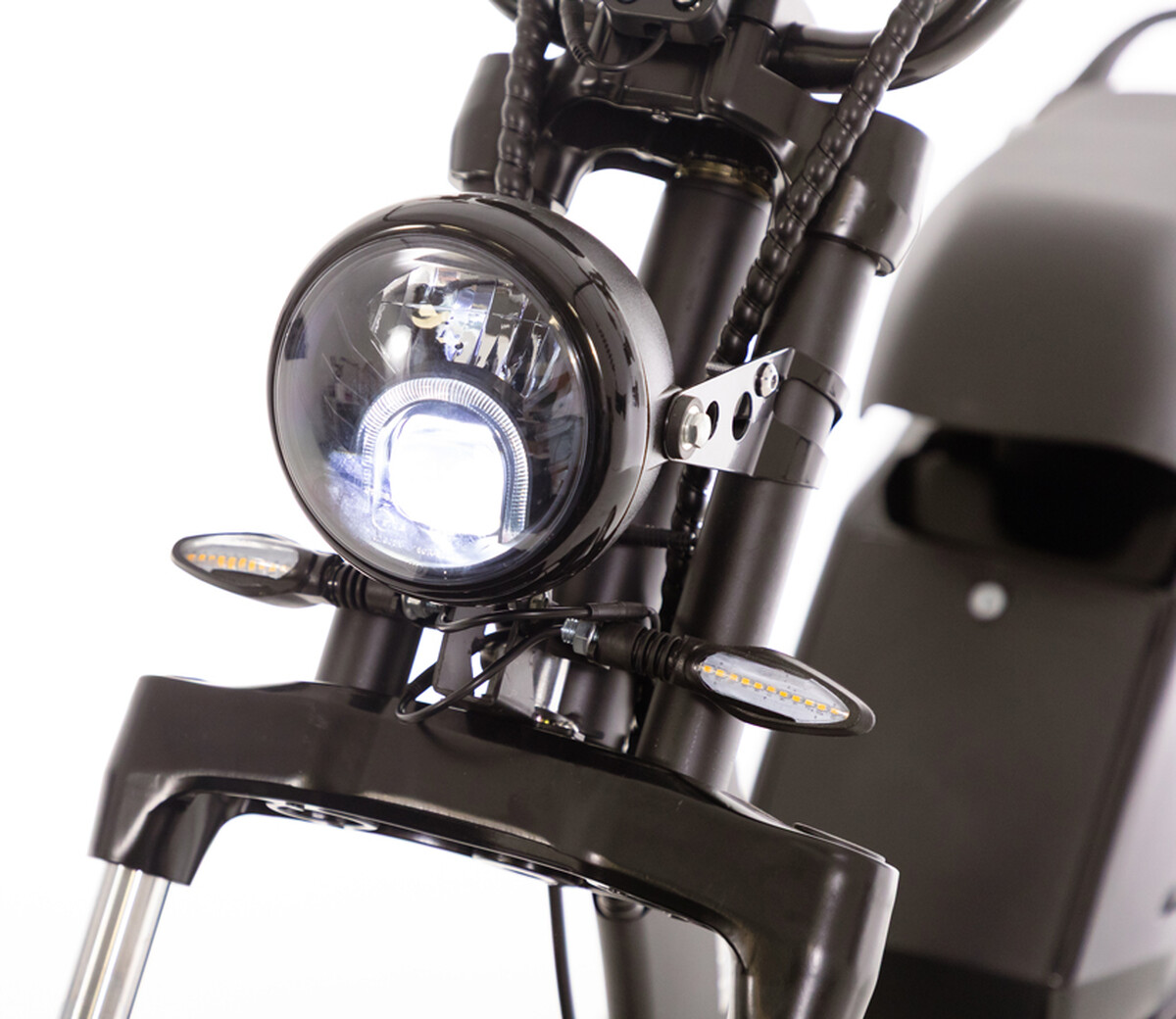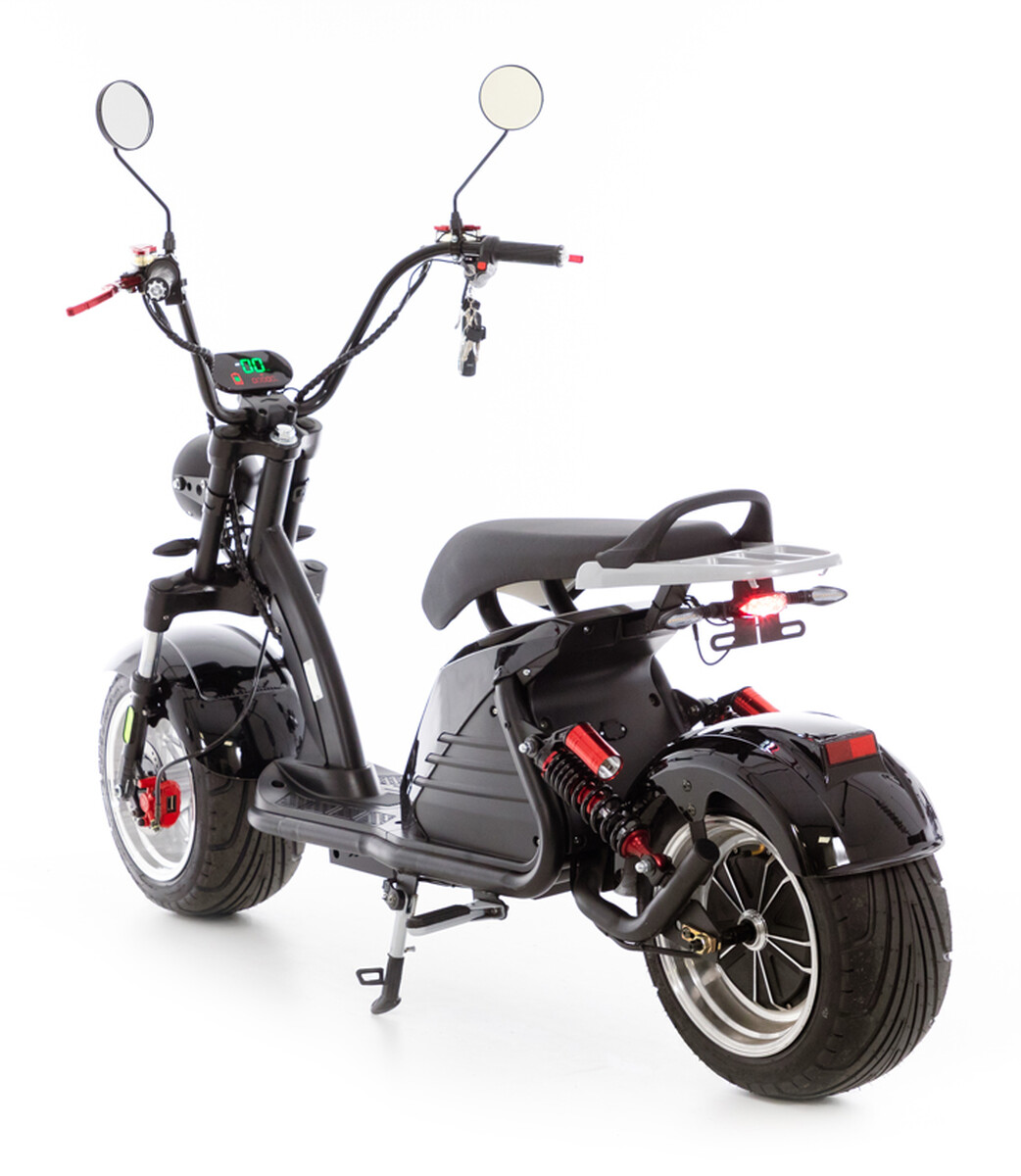 Scuter electric elegant, cu design Chopper, cu un motor puternic de 3000 W, un cadru robust și un confort excelent la condus - ideală atât pentru plimbări în oraș, cât și pentru agrement.