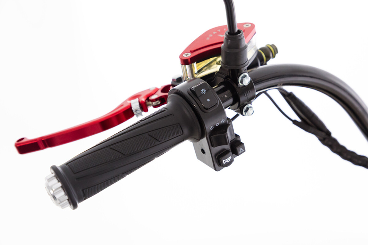 Chopperul electric pe două roți UNIZDRAV este echipat cu anvelope robuste „groase”, care asigură o stabilitate excelentă, aderență la drum și o distanță de frânare mai scurtă. Un nivel și mai ridicat de confort este oferit de suspensia hidraulică față în combinație cu amortizoarele pneumatice spate, care absorb eficient șocurile și contribuie la o călătorie lină în orice condiții.