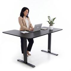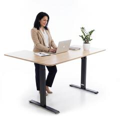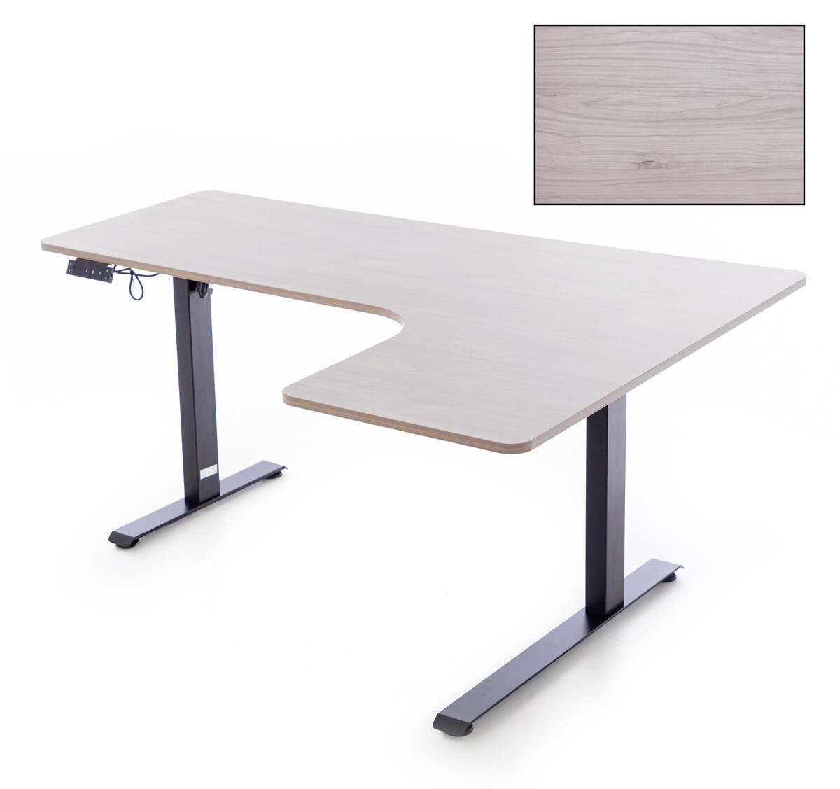 Birou reglabil electric pe înălțime (colțul din dreapta), ideal pentru alternarea muncii din șezut și din picioare. Memorie pentru 3 poziții de înălțime și cronometru pentru un confort și o productivitate sporite.