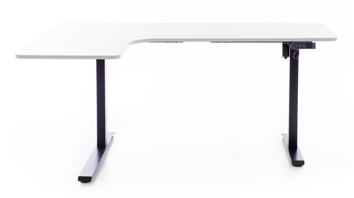 Birou reglabil electric pe înălțime (colțul stâng) pentru lucrul alternativ din șezut și din picioare. Memorie a 3 poziții de înălțime și cronometru pentru un confort și o productivitate sporite.